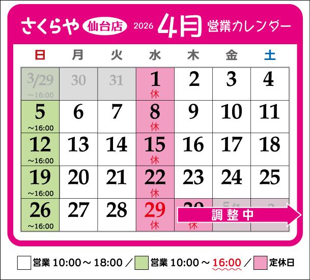 ●2026/03/30 4月の営業カレンダー掲載しました。