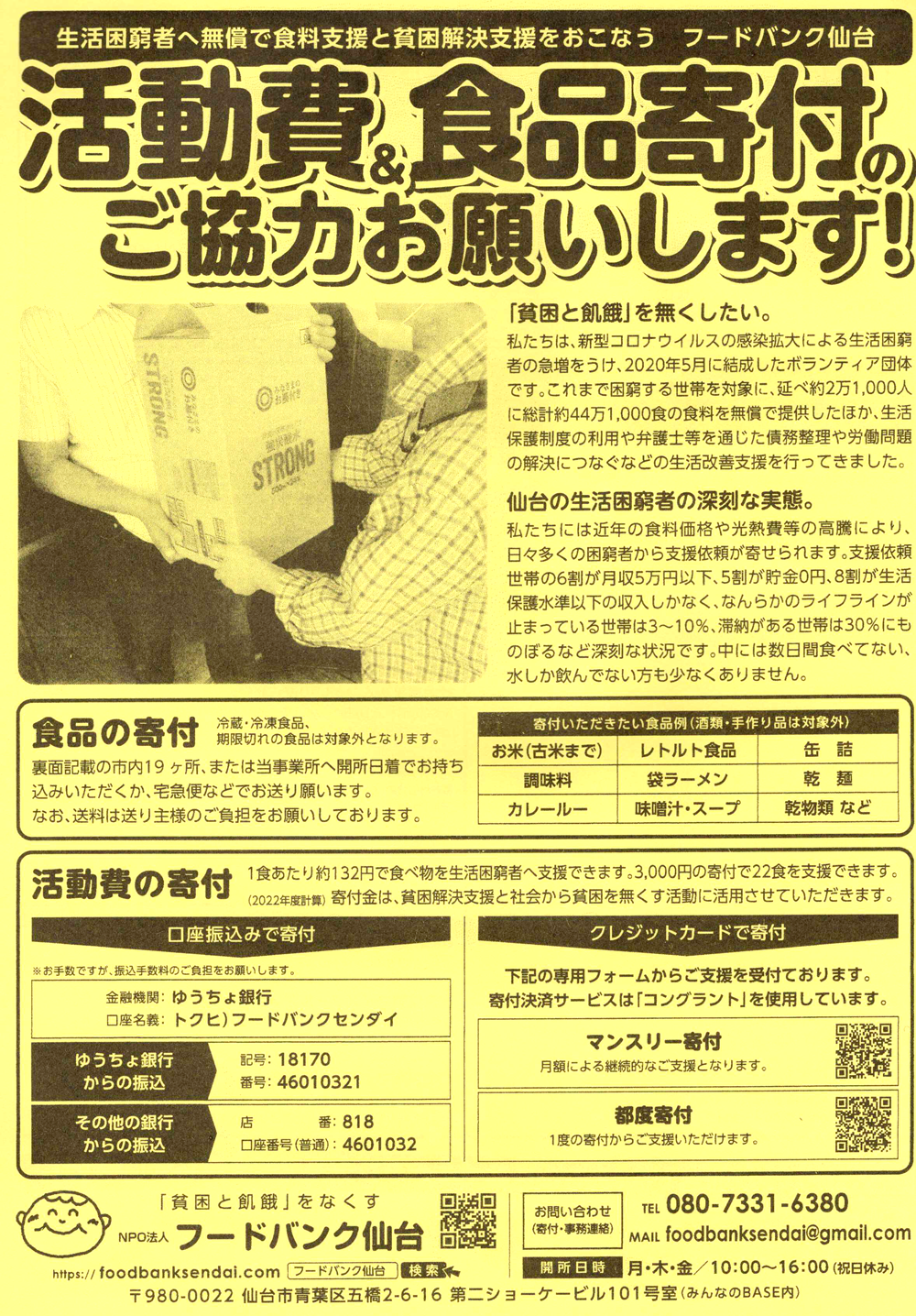 「フードバンクのような活動があることは知っていたけど、どこに持っていけば良いのか?」という方は、さくらや仙台店でもお預かりします。店頭にフードBOXを設置していますのでご利用ください。お持ちいただいた食料は「フードバンク仙台」を通じてお困りの方に届けられます。